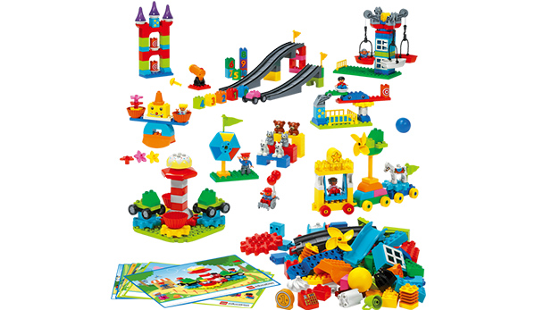 歯車や滑車、スロープなどを使って、楽しい動きのある遊園地を組み立てられるセットです。